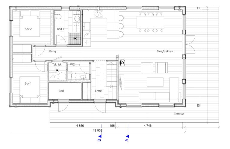Stue, kjøkken, 2 soverom, bad, ekstra wc, entre, teknisk rom og utvendig bod.