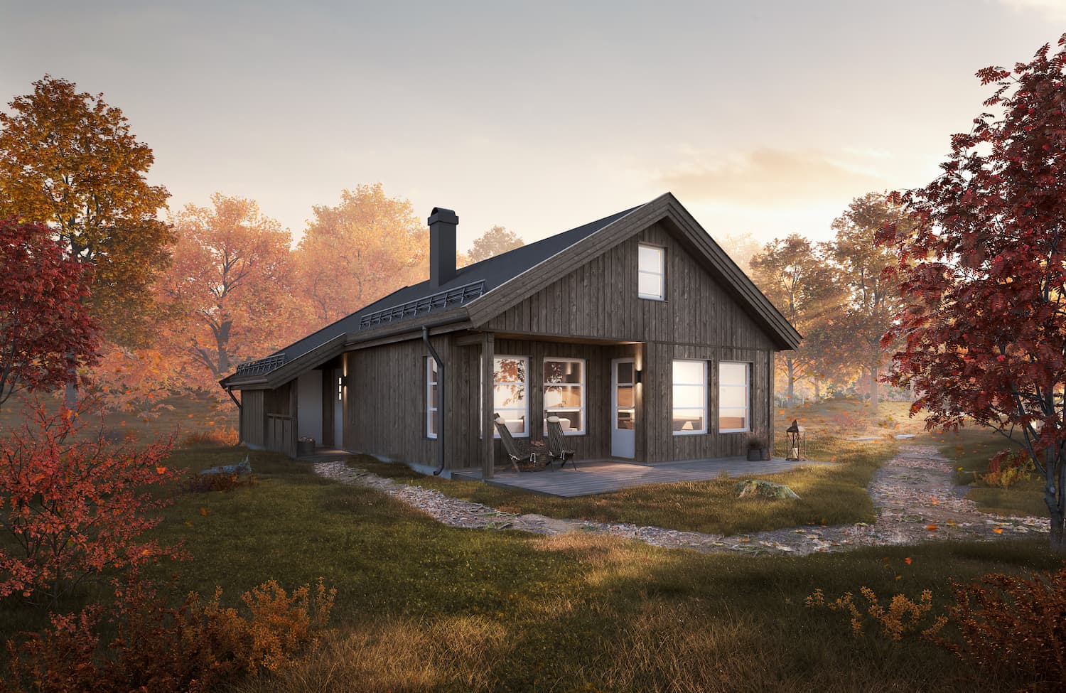 Infrastruktur på feltet, eiendomstomt, prosjektering og utforming av byggesøknad, opparbeidelse av tomt, med parkering for to biler på eller rett ved siden av tomta, støping av grunnmursplate eller annen tilpasset fundamentering klar for bygging, nøkkelferdig hytte fra våre leverandører, syrefaste festemidler og fraktkostnader.